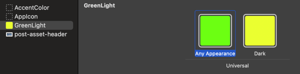 So, you can also change the name of the color to GreenLight. You should also specify the color for dark mode (it can be the same as the default; it’s your choice).